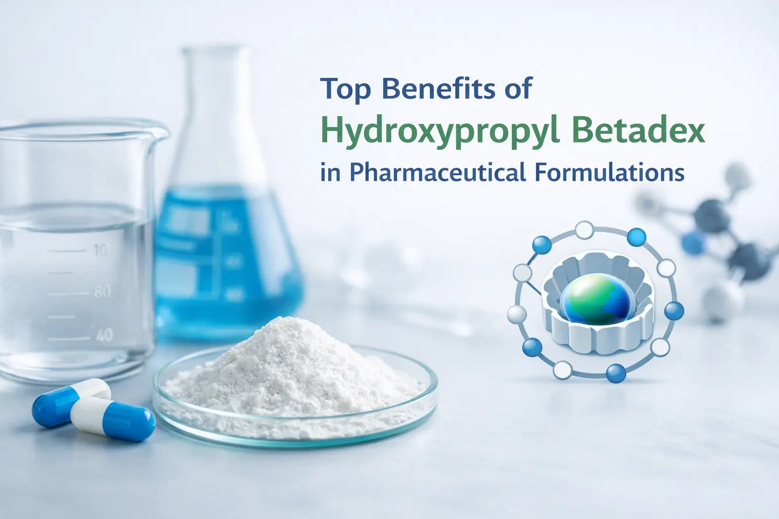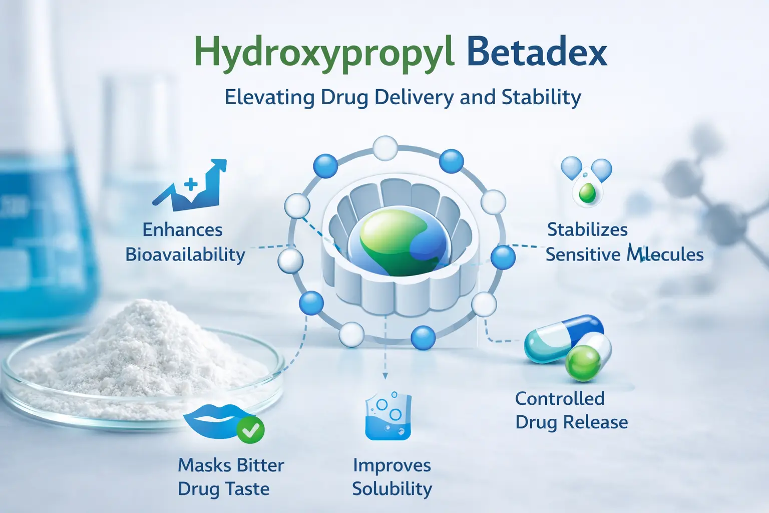 Om er zeker van te zijn dat farmaceutische toepassingen werken, is het belangrijk om de belangrijke eigenschappen van hydroxypropyl-bèta-cyclodextrine te begrijpen. Het molecuulgewicht ligt gewoonlijk tussen 1.400 en 1.800 Da, en de oplosbaarheid wordt beïnvloed door de mate van verandering. Het lost op in meer dan 500 mg/ml water, wat een enorme verbetering is ten opzichte van de oplosbaarheid van 18,5 mg/ml van natuurlijk bèta-cyclodextrine.